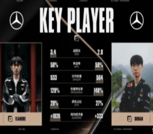 其中Flandre在战损比、承伤占比、场均经济差领先于Doran;而Doran在参战率、分均伤害以及伤害转换率高于Flandre。