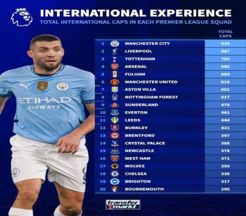 德转统计本赛季英超俱乐部球员国家队出场数排行榜: