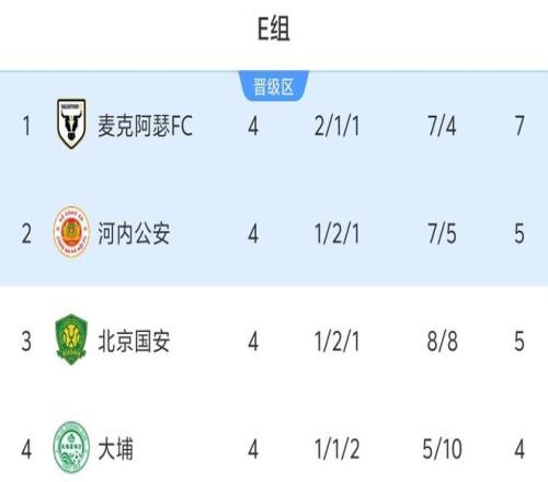 4轮过后的小组最新排名,北京国安凭借着首胜终于摆脱垫底,与河内公安同积5分,因净胜球劣势暂时排在小组第3,同时将大埔队挤到小组垫底。麦克阿瑟FC凭借着2胜1平的战绩积7分,反超河内公安排在小组第1。
