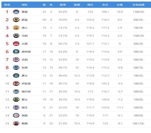 雷霆赢球后25胜2负高居联盟第一,快船输球后5连败,战绩6胜21负排名西部第14。